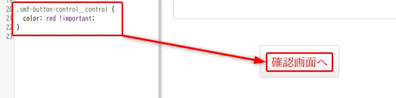 • 今回は、一番目立つ「送信ボタン(確認画面へ)」を調べたとしましょう。smf-action や smf-button-control__control といったクラス名が見つかります。これをコピーします。