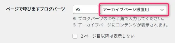 画面を下にスクロールすると、SWELL独自の「SWELL設定」セクションがあります。そこに「一覧ページ上部に表示するブログパーツ」という項目があるので、さっきSTEP 2で作ったブログパーツを選択します(数字は自動的に入力されます)。