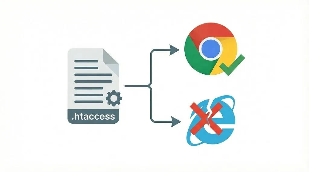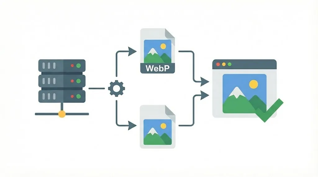 サーバー側で出し分けをする場合、必ず Header append Vary Accept を設定してください。これを忘れると、CDNやキャッシュサーバーが「Chrome用のWebP画像」をキャッシュしてしまい、次にアクセスしてきたIEユーザーにもWebPを返してしまう「キャッシュ汚染」事故が起きます。